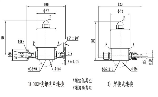 GDC-Q5 electromagnetic high vacuum belt inflatable valve is connected to the high and low vacuum system. The valve opens on the valve plate, closes the inflatable port and connects the P and A end pipelines; when the power is off, the valve plate closes, cuts off the P and A end pipelines to ensure the vacuum of the system, and opens the inflatable port at the same time, inflates the A end through the F end.