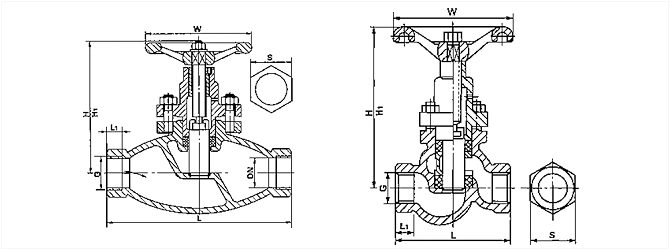 閥體長度 L | 接頭長度 L1 | 接頭長度 S | 手輪直徑 Do | 管螺紋 G (寸) | 關閉高度 H≈ | 開啟高度 H1≈ | 重量 (kg) | |