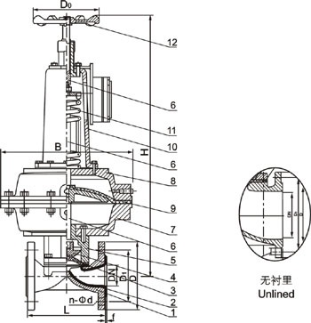 部件列表:1、閥體 2、閥體襯里 3、隔膜 4、閥瓣 5、下閥桿 6、閥蓋 7、氣缸 8、活塞 9、彈簧 10、氣缸蓋 11、上閥桿 12、手輪